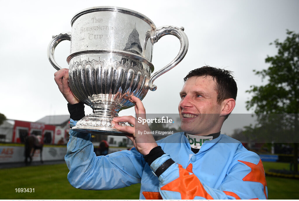 30 April 2019; Jockey Paul Townend celebrates with the cup after winning the BoyleSports Champion Steeplechase on Un De Sceaux at Punchestown Racecourse in Naas, Kildare. Photo by David Fitzgerald/Sportsfile