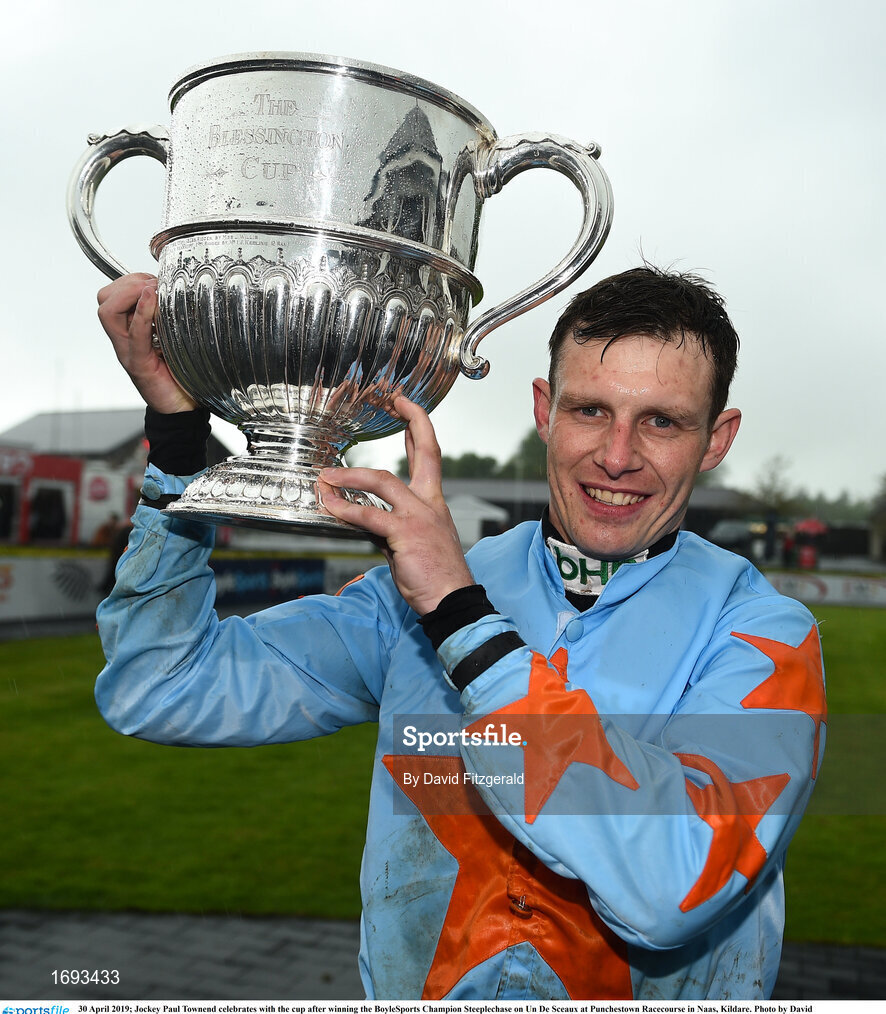30 April 2019; Jockey Paul Townend celebrates with the cup after winning the BoyleSports Champion Steeplechase on Un De Sceaux at Punchestown Racecourse in Naas, Kildare. Photo by David Fitzgerald/Sportsfile