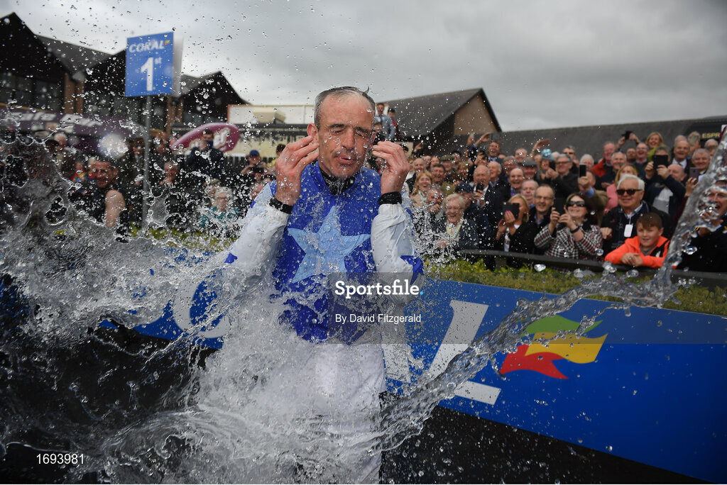 1 May 2019; Ruby Walsh is soaked by fellow jockeys after he announced his retirement after he rode Kemboy to win The Coral Punchestown Gold Cup during the Punchestown Festival Gold Cup Day at Punchestown Racecourse in Naas, Kildare. Photo by David Fitzgerald/Sportsfile