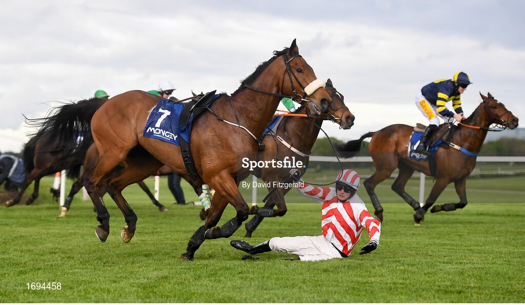 2 May 2019; Luke McGuinness falls on Like A Demon as they go over Ruby's Double during the Mongey Communications La Touche Cup Cross Country Steeplechase at Punchestown Racecourse in Naas, Kildare. Photo by David Fitzgerald/Sportsfile
