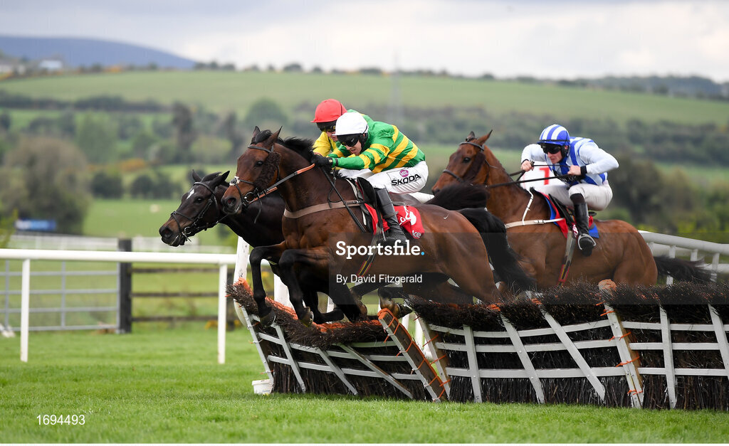 2 May 2019; Unowhatimeanharry, with Mark Walsh up, (9), jump the last ahead of Killultagh Vic, with David Mullins up, right, and Vision Des Flos, with Tom Scudamore up, on their way to winning the Ladbrokes Champion Stayers Hurdle at Punchestown Racecourse in Naas, Kildare. Photo by David Fitzgerald/Sportsfile