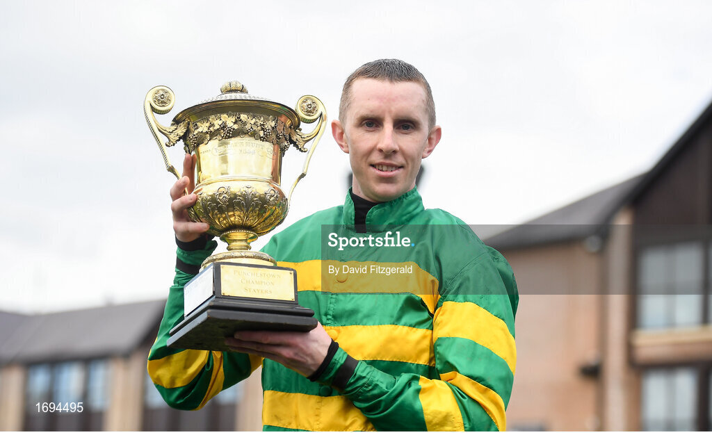2 May 2019; Mark Walsh celebrates with the cup after riding Unowhatimeanharry to win the Ladbrokes Champion Stayers Hurdle at Punchestown Racecourse in Naas, Kildare. Photo by David Fitzgerald/Sportsfile