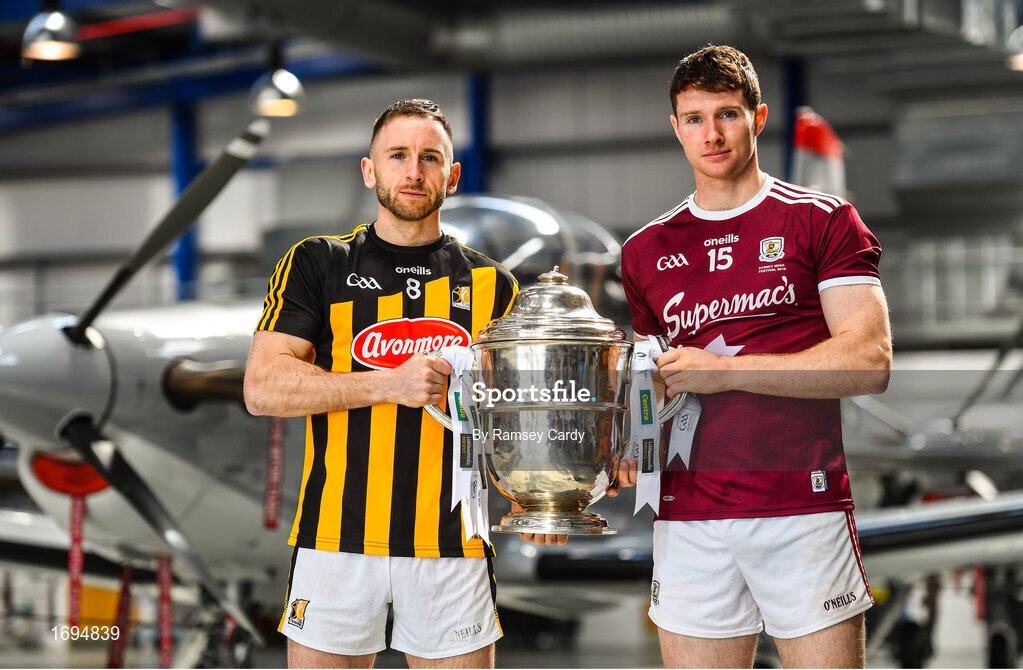 3 May 2019; Kilkenny hurler Conor Fogarty, left, and Galway hurler Pauric Mannion during the launch of the Leinster GAA Senior Championships at the Casement Aerodrome in Baldonnel, Dublin. Photo by Ramsey Cardy/Sportsfile