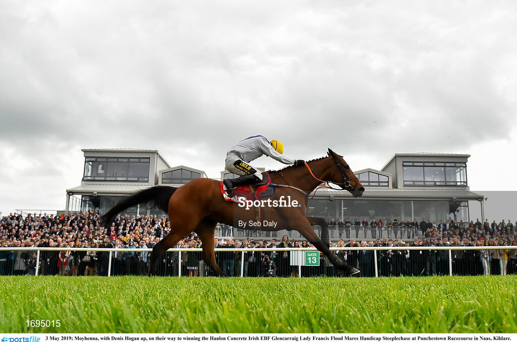 3 May 2019; Moyhenna, with Denis Hogan up, on their way to winning the Hanlon Concrete Irish EBF Glencarraig Lady Francis Flood Mares Handicap Steeplechase at Punchestown Racecourse in Naas, Kildare. Photo by Seb Daly/Sportsfile