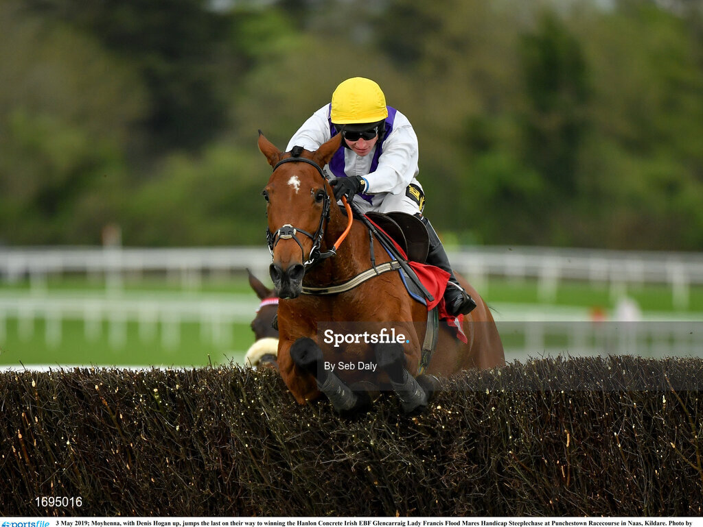 3 May 2019; Moyhenna, with Denis Hogan up, jumps the last on their way to winning the Hanlon Concrete Irish EBF Glencarraig Lady Francis Flood Mares Handicap Steeplechase at Punchestown Racecourse in Naas, Kildare. Photo by Seb Daly/Sportsfile