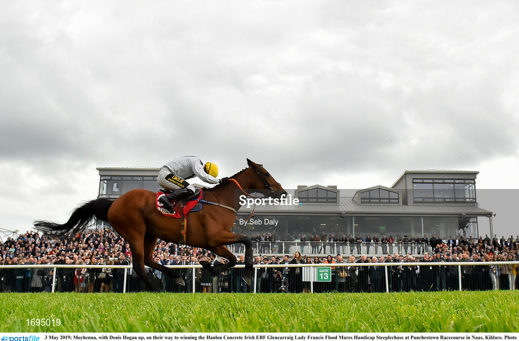 3 May 2019; Moyhenna, with Denis Hogan up, on their way to winning the Hanlon Concrete Irish EBF Glencarraig Lady Francis Flood Mares Handicap Steeplechase at Punchestown Racecourse in Naas, Kildare. Photo by Seb Daly/Sportsfile