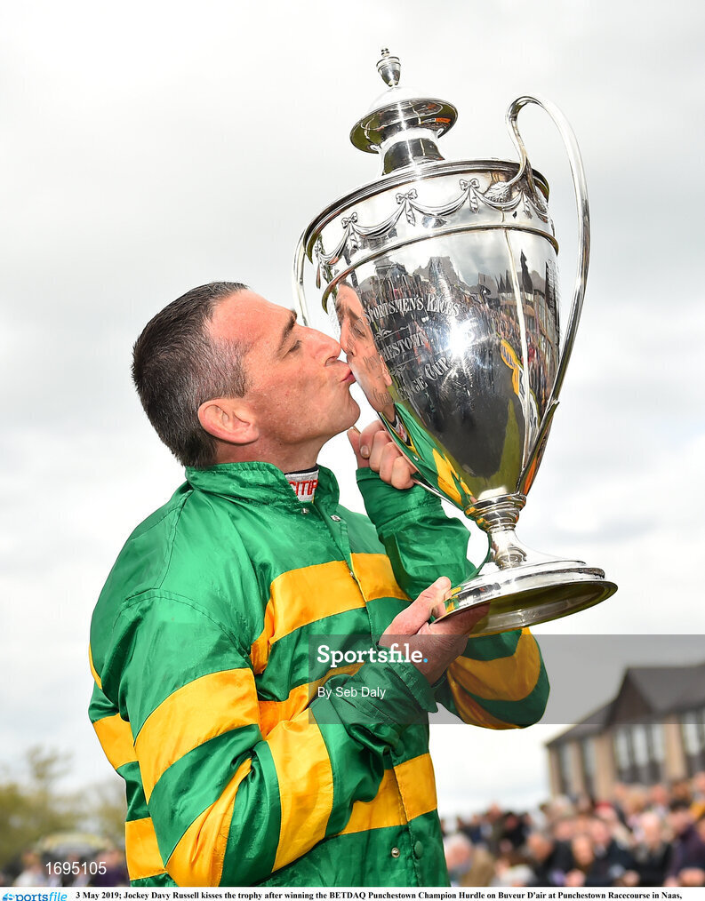 3 May 2019; Jockey Davy Russell kisses the trophy after winning the BETDAQ Punchestown Champion Hurdle on Buveur D'air at Punchestown Racecourse in Naas, Kildare. Photo by Seb Daly/Sportsfile