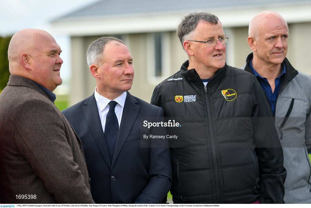 3 May 2019; Football managers, from left, John Evans of Wicklow, Jim Gavin of Dublin, Tom Wogan of Carlow, John Maughan of Offaly, during the launch of the Leinster GAA Senior Championships at the Casement Aerodrome in Baldonnel, Dublin. Photo by Ramsey Cardy/Sportsfile