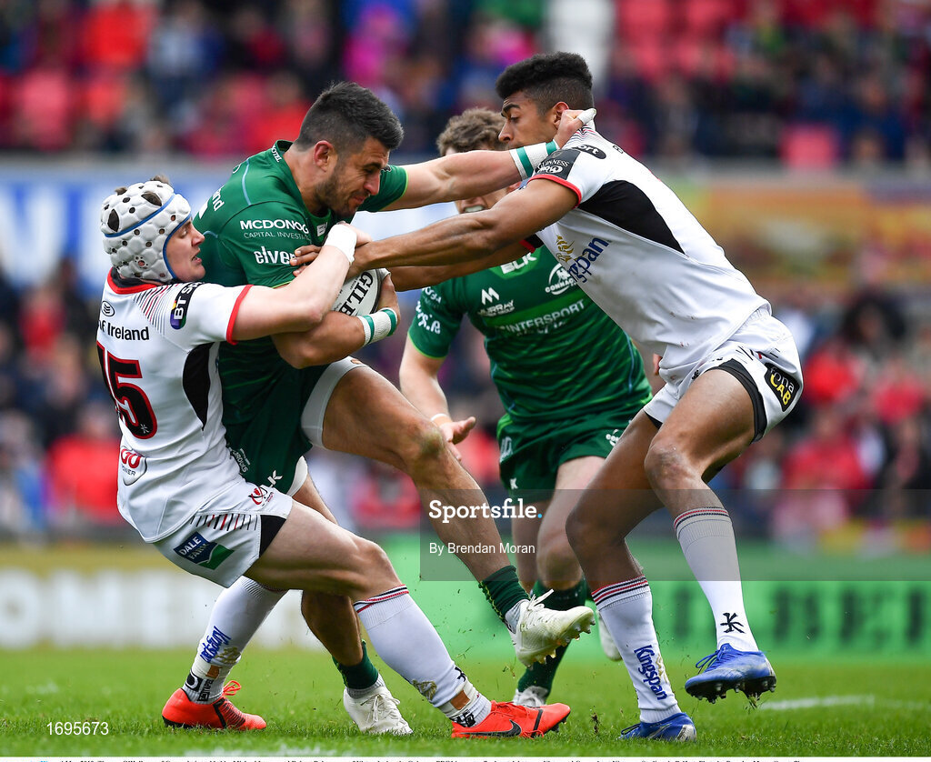 4 May 2019; Tiernan O’Halloran of Connacht is tackled by Michael Lowry and Robert Baloucoune of Ulster during the Guinness PRO14 quarter-final match between Ulster and Connacht at Kingspan Stadium in Belfast. Photo by Brendan Moran/Sportsfile