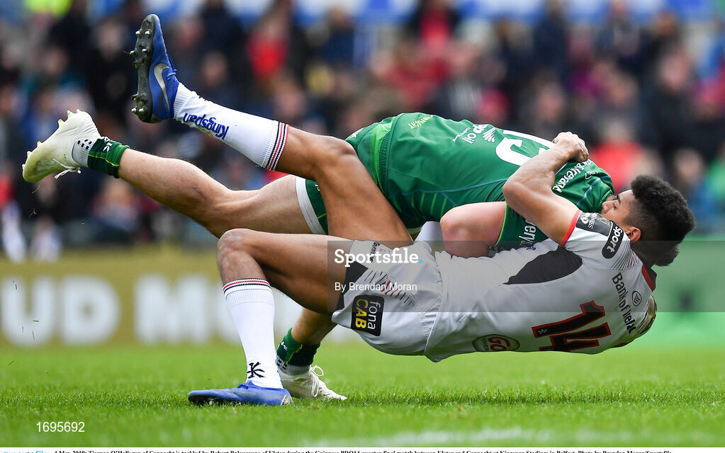 4 May 2019; Tiernan O’Halloran of Connacht is tackled by Robert Baloucoune of Ulster during the Guinness PRO14 quarter-final match between Ulster and Connacht at Kingspan Stadium in Belfast. Photo by Brendan Moran/Sportsfile