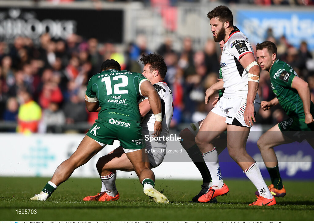 4 May 2019; Billy Burns of Ulster is tackled by Bundee Aki of Connacht resulting in a penalty during the Guinness PRO14 quarter-final match between Ulster and Connacht at Kingspan Stadium in Belfast. Photo by David Fitzgerald/Sportsfile
