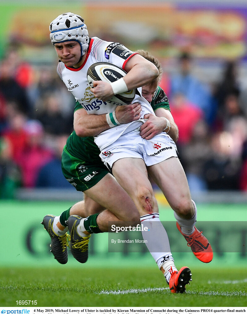 4 May 2019; Michael Lowry of Ulster is tackled by Kieran Marmion of Connacht during the Guinness PRO14 quarter-final match between Ulster and Connacht at Kingspan Stadium in Belfast. Photo by Brendan Moran/Sportsfile