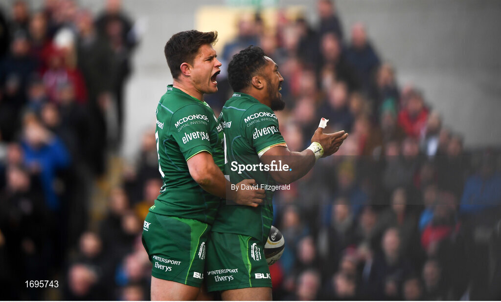 4 May 2019; Bundee Aki of Connacht is congratulated by team-mate Dave Heffernan scoring his side's first try during the Guinness PRO14 quarter-final match between Ulster and Connacht at Kingspan Stadium in Belfast. Photo by David Fitzgerald/Sportsfile