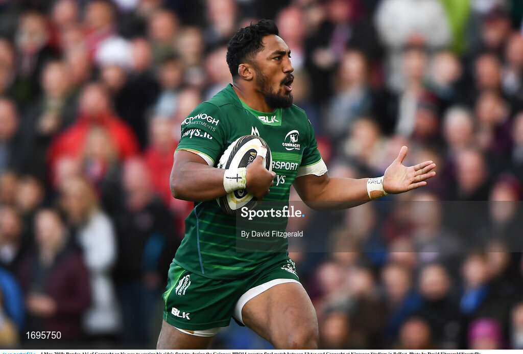 4 May 2019; Bundee Aki of Connacht on his way to scoring his side's first try during the Guinness PRO14 quarter-final match between Ulster and Connacht at Kingspan Stadium in Belfast. Photo by David Fitzgerald/Sportsfile