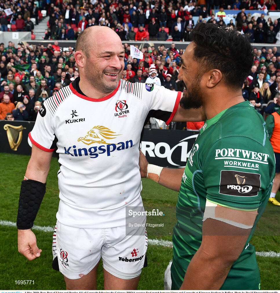 4 May 2019; Rory Best of Ulster and Bundee Aki of Connacht following the Guinness PRO14 quarter-final match between Ulster and Connacht at Kingspan Stadium in Belfast. Photo by David Fitzgerald/Sportsfile