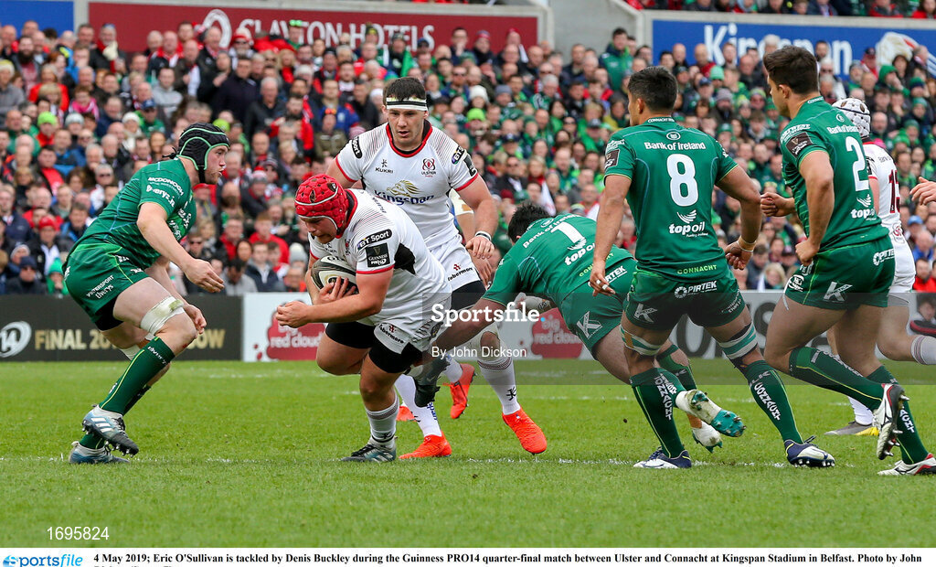 4 May 2019; Eric O'Sullivan of Ulster is tackled by Denis Buckley of Connacht during the Guinness PRO14 quarter-final match between Ulster and Connacht at Kingspan Stadium in Belfast. Photo by John Dickson/Sportsfile