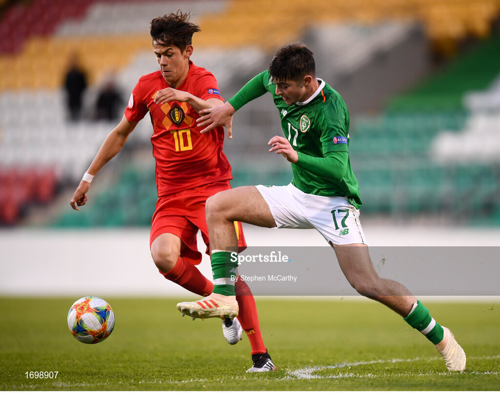 9 May 2019; Sean Kennedy of Republic of Ireland in action against Mathias De Wolf of Belgium during the 2019 UEFA European Under-17 Championships Group A match between Belgium and Republic of Ireland at Tallaght Stadium in Dublin. Photo by Stephen McCarthy/Sportsfile