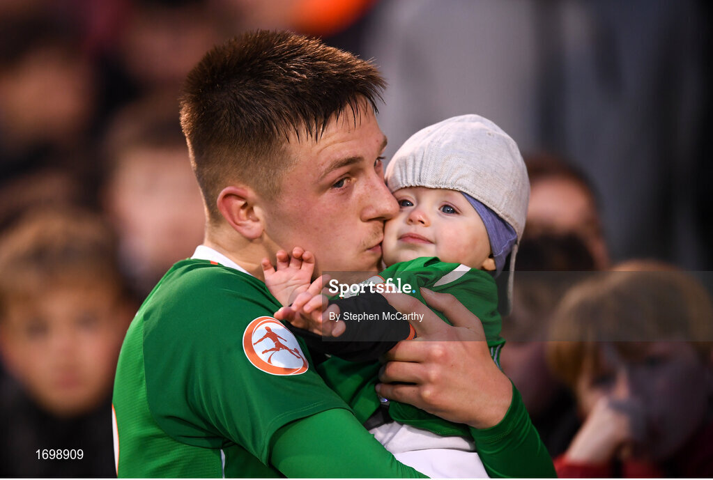9 May 2019; Ronan McKinley of Republic of Ireland shares a moment with his 1-year-old brother Johnas following the 2019 UEFA European Under-17 Championships Group A match between Belgium and Republic of Ireland at Tallaght Stadium in Dublin. Photo by Stephen McCarthy/Sportsfile
