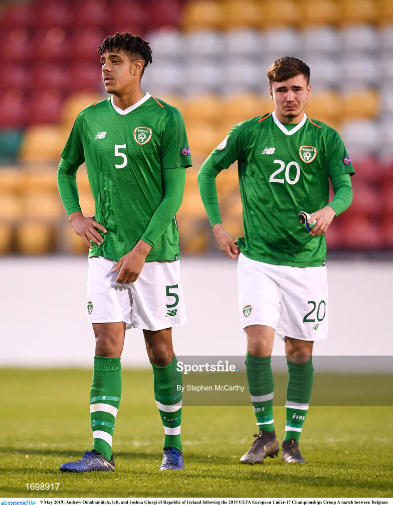 9 May 2019; Andrew Omobamidele, left, and Joshua Giurgi of Republic of Ireland following the 2019 UEFA European Under-17 Championships Group A match between Belgium and Republic of Ireland at Tallaght Stadium in Dublin. Photo by Stephen McCarthy/Sportsfile
