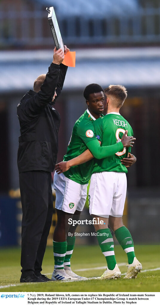 9 May 2019; Roland Idowu, left, comes on to replace his Republic of Ireland team-mate Séamas Keogh during the 2019 UEFA European Under-17 Championships Group A match between Belgium and Republic of Ireland at Tallaght Stadium in Dublin. Photo by Stephen McCarthy/Sportsfile