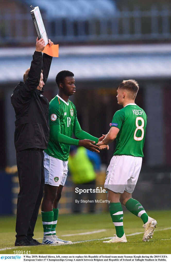 9 May 2019; Roland Idowu, left, comes on to replace his Republic of Ireland team-mate Séamas Keogh during the 2019 UEFA European Under-17 Championships Group A match between Belgium and Republic of Ireland at Tallaght Stadium in Dublin. Photo by Stephen McCarthy/Sportsfile
