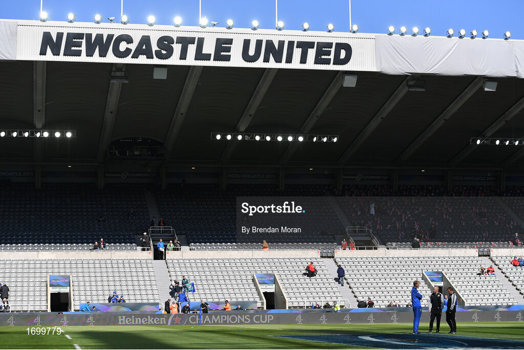 11 May 2019; Leinster head coach Leo Cullen and Saracens head coach Mark McCall chat prior to the Heineken Champions Cup Final match between Leinster and Saracens at St James' Park in Newcastle Upon Tyne, England. Photo by Brendan Moran/Sportsfile