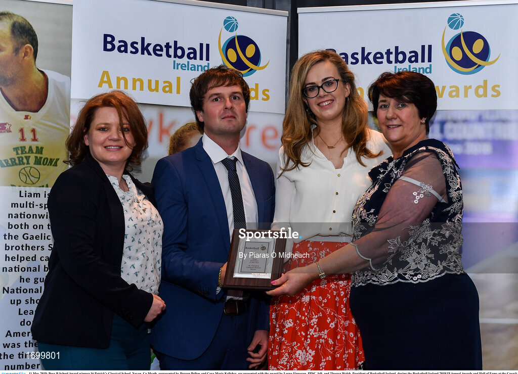 11 May 2019; Boys B School Award winners St Patrick’s Classical School, Navan, Co Meath, represented by Darren Bellew and Cora Marie Kelleher, are presented with the award by Lorna Finnegan, PPSC, left, and Theresa Walsh, President of Basketball Ireland, during the Basketball Ireland 2018/19 Annual Awards and Hall of Fame at the Cusack Suite, Croke Park in Dublin. Photo by Piaras Ó Mídheach/Sportsfile
