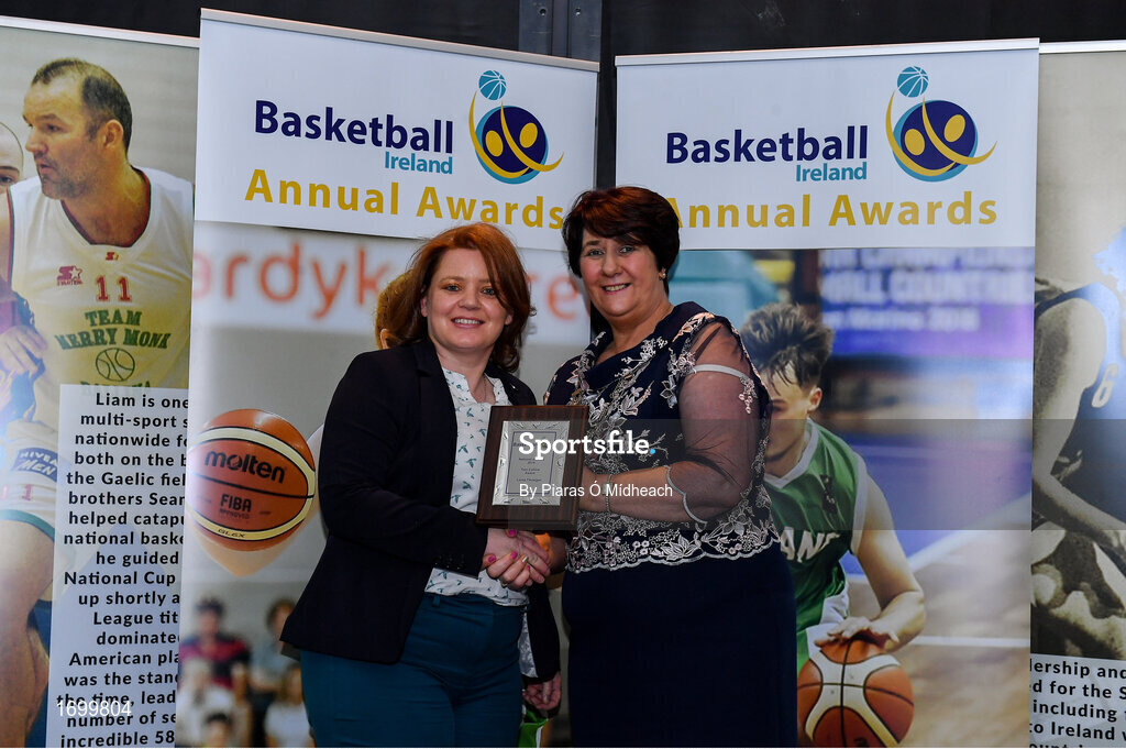 11 May 2019; Post Primary Schools – Tom Collins Award winner Lorna Finnegan, left, is presented with her award by Theresa Walsh, President of Basketball Ireland, during the Basketball Ireland 2018/19 Annual Awards and Hall of Fame at the Cusack Suite, Croke Park in Dublin. Photo by Piaras Ó Mídheach/Sportsfile