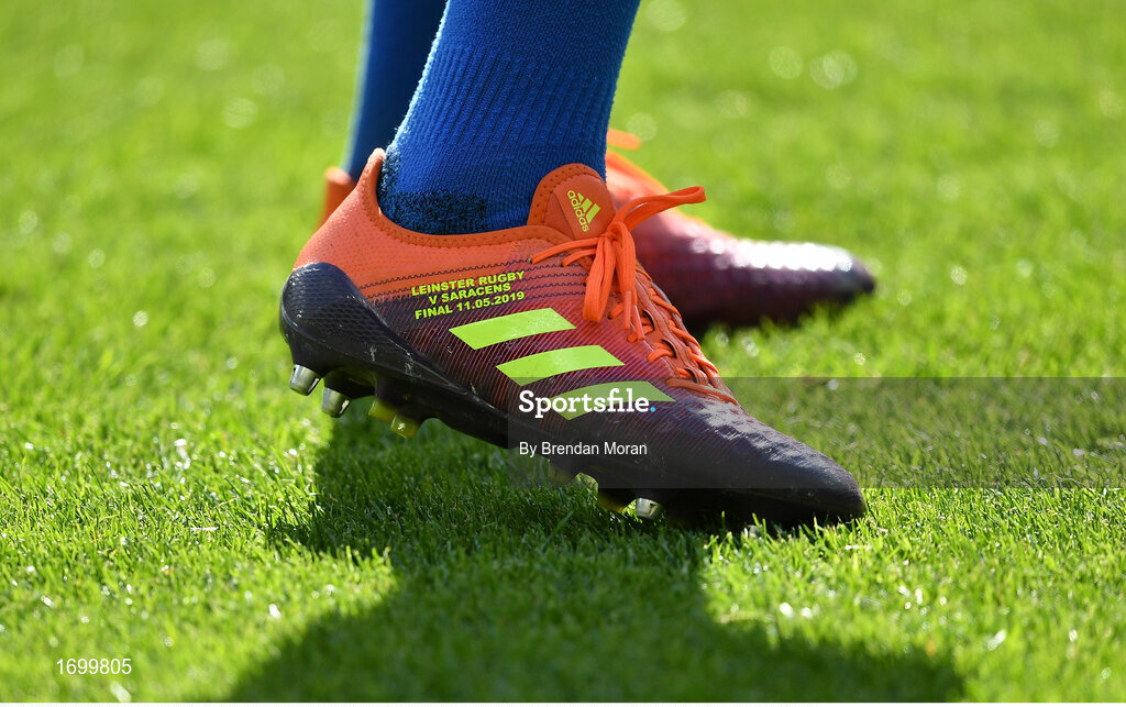 11 May 2019; The personalised boots of Jonathan Sexton of Leinster prior to the Heineken Champions Cup Final match between Leinster and Saracens at St James' Park in Newcastle Upon Tyne, England. Photo by Brendan Moran/Sportsfile