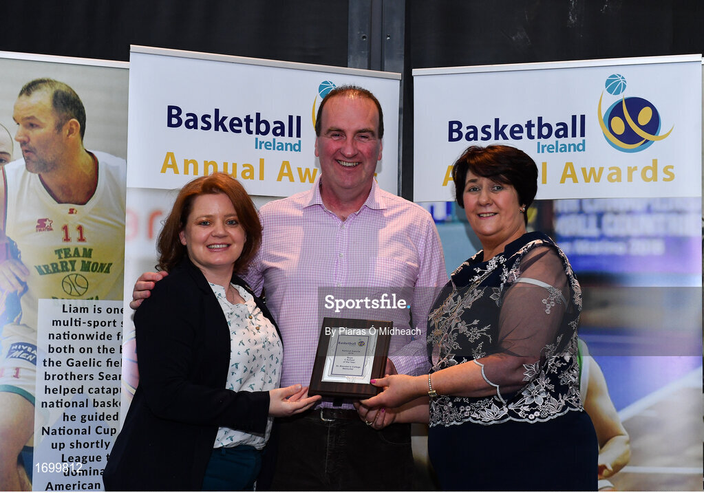 11 May 2019; Boys C School Award winners St Brendan’s Belmullet, Co Mayo, represented by Damien Lavelle, are presented with the award by Lorna Finnegan, PPSC, left, and Theresa Walsh, President of Basketball Ireland, during the Basketball Ireland 2018/19 Annual Awards and Hall of Fame at the Cusack Suite, Croke Park in Dublin. Photo by Piaras Ó Mídheach/Sportsfile