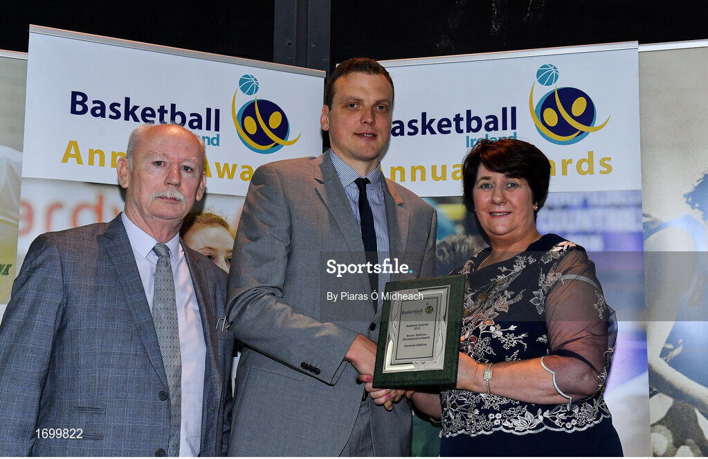11 May 2019; Senior Referee Development Award winner Aurimus Statkus is presented with his award by Dave Smith, National Referees Committee and Theresa Walsh, President of Basketball Ireland, during the Basketball Ireland 2018/19 Annual Awards and Hall of Fame at the Cusack Suite, Croke Park in Dublin. Photo by Piaras Ó Mídheach/Sportsfile