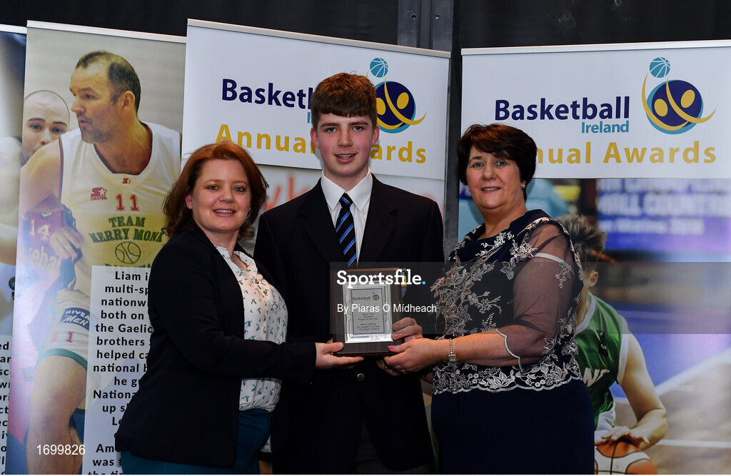 11 May 2019; Male U16 Schools Player of the Year Award winner Brian Gaffney from St Joseph’s The Bish, Co Galway, is presented with his award by Lorna Finnegan, PPSC, left, and Theresa Walsh, President of Basketball Ireland, during the Basketball Ireland 2018/19 Annual Awards and Hall of Fame at the Cusack Suite, Croke Park in Dublin. Photo by Piaras Ó Mídheach/Sportsfile