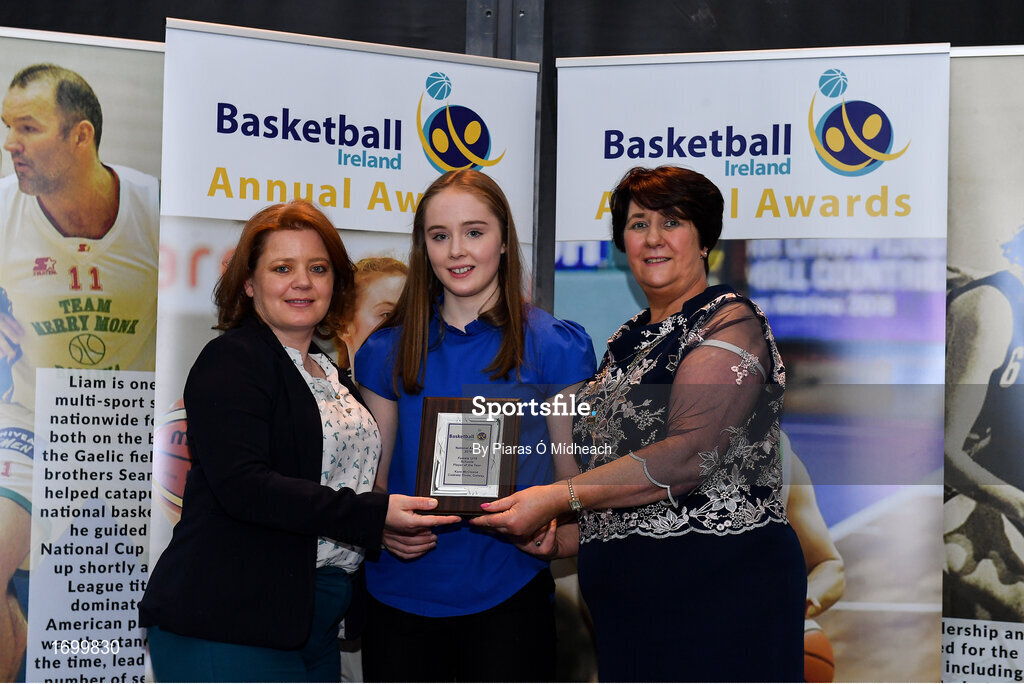 11 May 2019; Female U16 Schools Player of the Year Award winner Kara McCleane from Coláiste Éinde, Co Galway, is presented with her award by Lorna Finnegan, PPSC, left, and Theresa Walsh, President of Basketball Ireland, during the Basketball Ireland 2018/19 Annual Awards and Hall of Fame at the Cusack Suite, Croke Park in Dublin. Photo by Piaras Ó Mídheach/Sportsfile