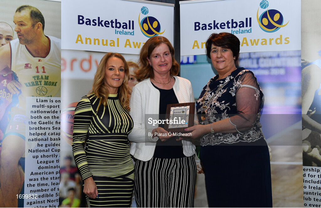 11 May 2019; Primary Schools Appreciation Award winner Catherine Leahy, is presented with her award by Carmel Murphy, left, and Theresa Walsh, President of Basketball Ireland, during the Basketball Ireland 2018/19 Annual Awards and Hall of Fame at the Cusack Suite, Croke Park in Dublin. Photo by Piaras Ó Mídheach/Sportsfile
