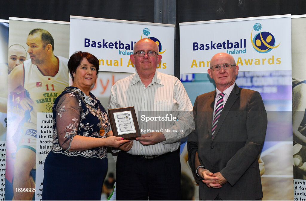 11 May 2019; WD1 Coach of the Year Joe Shields of Maree is presented with his award by Theresa Walsh, President of Basketball Ireland, and Fran Ryan, Chairperson of the Board of Basketball Ireland, during the Basketball Ireland 2018/19 Annual Awards and Hall of Fame at the Cusack Suite, Croke Park in Dublin. Photo by Piaras Ó Mídheach/Sportsfile
