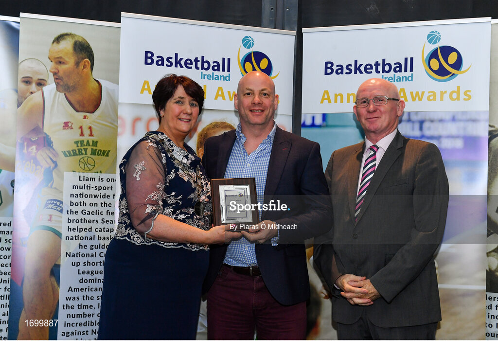 11 May 2019; WSL Coach of the Year award winner Mark Byrne of Courtyard Liffey Celtics is presented with his award by Theresa Walsh, President of Basketball Ireland, and Fran Ryan, Chairperson of the Board of Basketball Ireland, during the Basketball Ireland 2018/19 Annual Awards and Hall of Fame at the Cusack Suite, Croke Park in Dublin. Photo by Piaras Ó Mídheach/Sportsfile