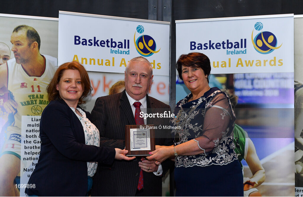 11 May 2019; Boys School Coach of the Year Award winner Philip Rigney from Templeogue College, Dublin, is presented with his award by Lorna Finnegan, PPSC, left, and Theresa Walsh, President of Basketball Ireland, during the Basketball Ireland 2018/19 Annual Awards and Hall of Fame at the Cusack Suite, Croke Park in Dublin. Photo by Piaras Ó Mídheach/Sportsfile