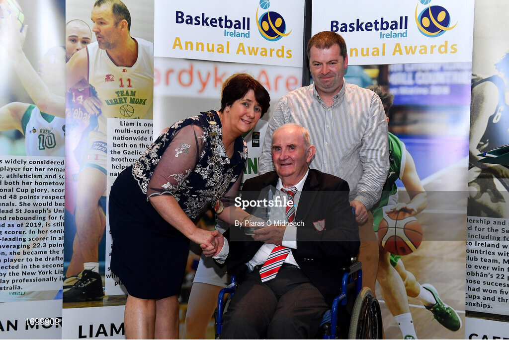 11 May 2019; Presidents Lifetime Achievement Award winner Andrew Drumm, alongside Seán Hickey, is presented with his award by Theresa Walsh, President of Basketball Ireland, during the Basketball Ireland 2018/19 Annual Awards and Hall of Fame at the Cusack Suite, Croke Park in Dublin. Photo by Piaras Ó Mídheach/Sportsfile