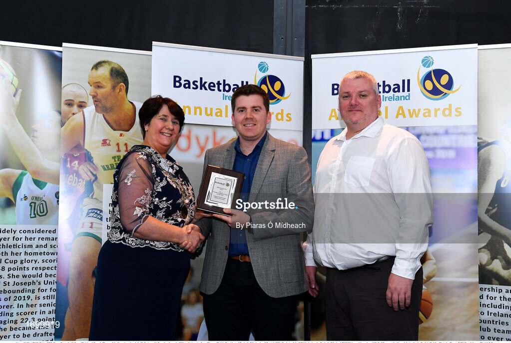 11 May 2019; Brian O'Malley collects the Colleges Division 1 Female Player of the Year Award on behalf of winner Kollyns Scarbrough of Ulster University from Theresa Walsh, President of Basketball Ireland and Patrick O’Neill, chair of the NBCC, during the Basketball Ireland 2018/19 Annual Awards and Hall of Fame at the Cusack Suite, Croke Park in Dublin. Photo by Piaras Ó Mídheach/Sportsfile