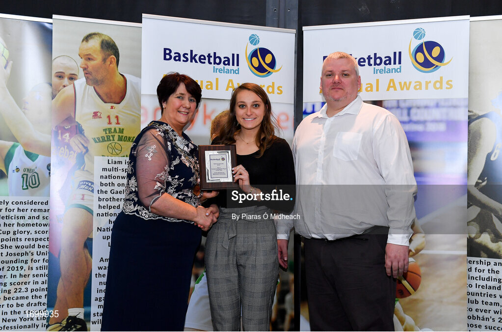 11 May 2019; Colleges Division 2 Female Player of the Year Award winner Jamie Sherburne of Maynooth University is presented with her award by Theresa Walsh, President of Basketball Ireland and Patrick O’Neill, chair of the NBCC, during the Basketball Ireland 2018/19 Annual Awards and Hall of Fame at the Cusack Suite, Croke Park in Dublin. Photo by Piaras Ó Mídheach/Sportsfile