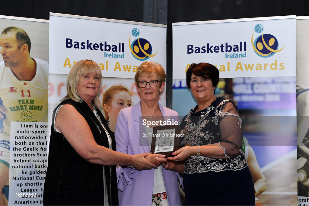 11 May 2019; Mary O’Dwyer accepts the WSL Player of the Year award on behalf of Allie LeClaire of Courtyard Liffey Celtics, from Breda Dick, WNLC, left, and Theresa Walsh, President of Basketball Ireland, during the Basketball Ireland 2018/19 Annual Awards and Hall of Fame at the Cusack Suite, Croke Park in Dublin. Photo by Piaras Ó Mídheach/Sportsfile