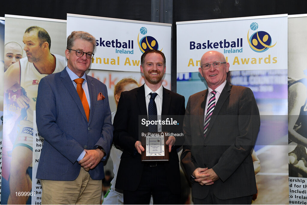 11 May 2019; Gareth Fulton accepts the MSL Young Player of the Year award on behalf of CJ Fulton of Belfast Star from Paul Keane of Reddy Charlton Solicitors, left, and Fran Ryan, Chairperson of the Board of Basketball Ireland, during the Basketball Ireland 2018/19 Annual Awards and Hall of Fame at the Cusack Suite, Croke Park in Dublin. Photo by Piaras Ó Mídheach/Sportsfile