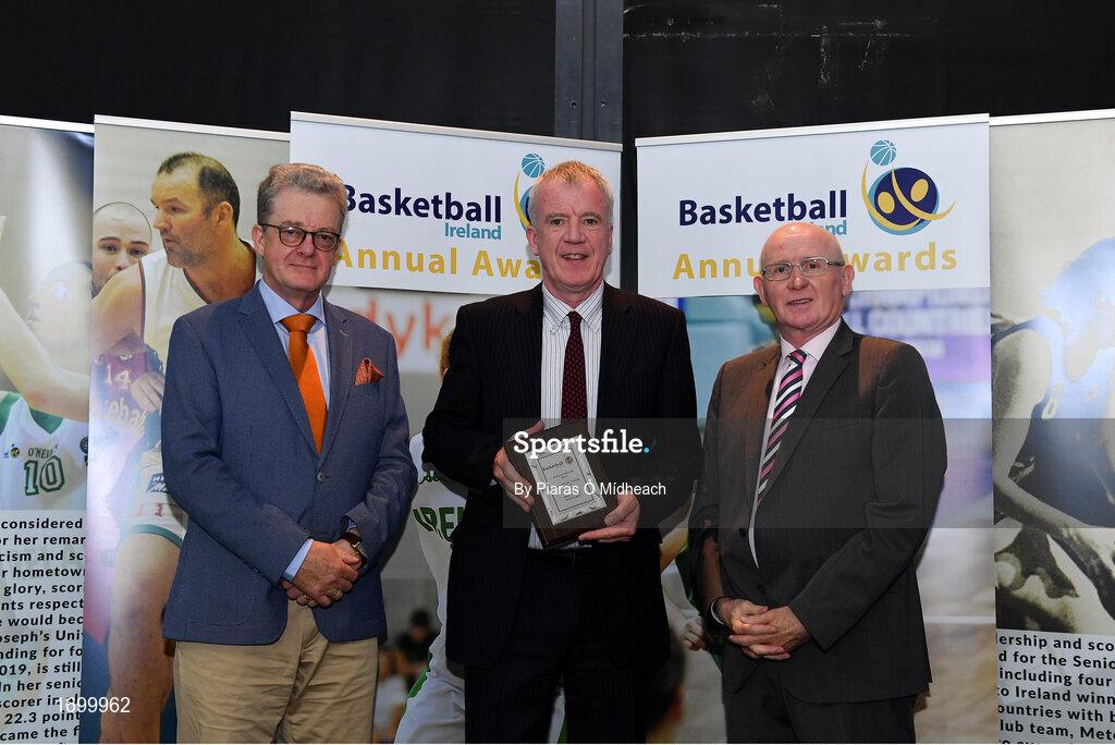 11 May 2019; Eddie Guilmartin accepts the MSL Player of the Year on behalf of Jason Killeen of Templeogue from Paul Keane of Reddy Charlton Solicitors, left, and Fran Ryan, Chairperson of the Board of Basketball Ireland, during the Basketball Ireland 2018/19 Annual Awards and Hall of Fame at the Cusack Suite, Croke Park in Dublin. Photo by Piaras Ó Mídheach/Sportsfile