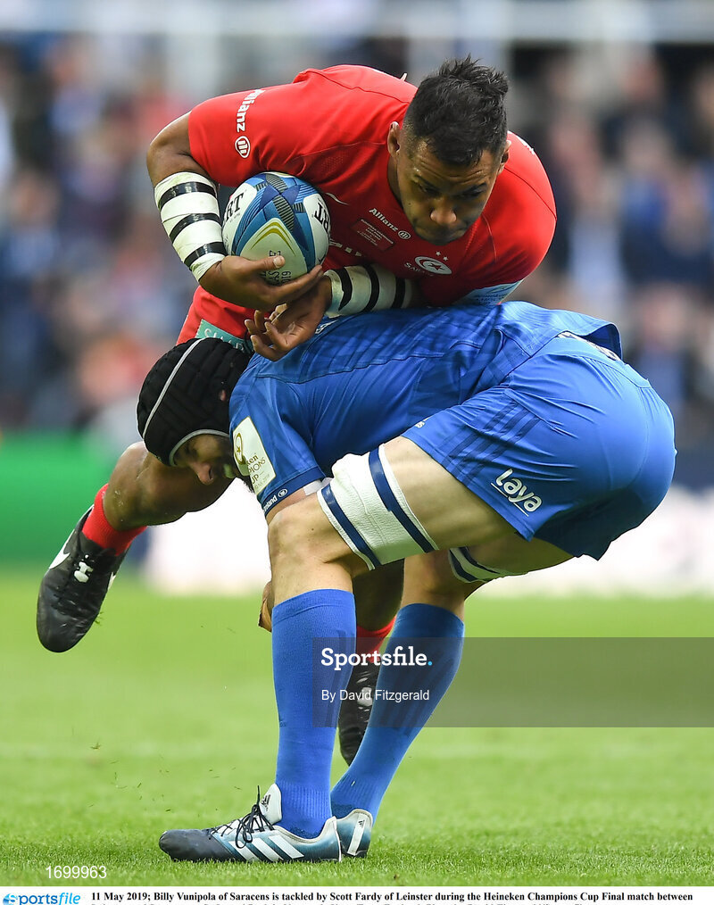 11 May 2019; Billy Vunipola of Saracens is tackled by Scott Fardy of Leinster during the Heineken Champions Cup Final match between Leinster and Saracens at St James' Park in Newcastle Upon Tyne, England. Photo by David Fitzgerald/Sportsfile