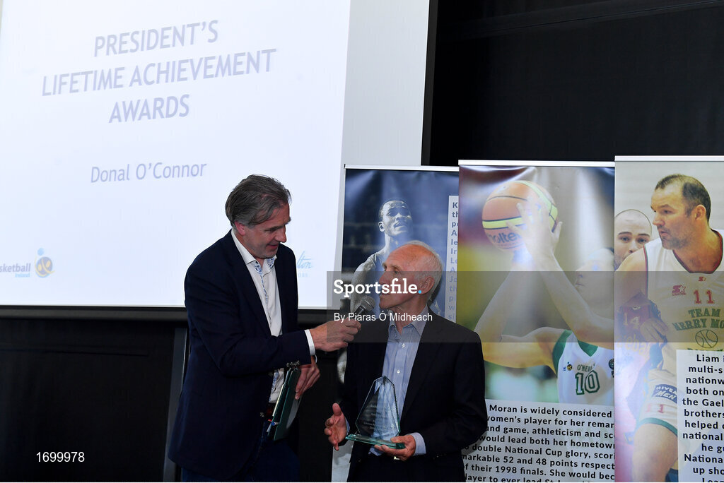 11 May 2019; Presidents Lifetime Achievement Award winner Donal O’Connor is interviewed by MC John Irwin during the Basketball Ireland 2018/19 Annual Awards and Hall of Fame at the Cusack Suite, Croke Park in Dublin. Photo by Piaras Ó Mídheach/Sportsfile