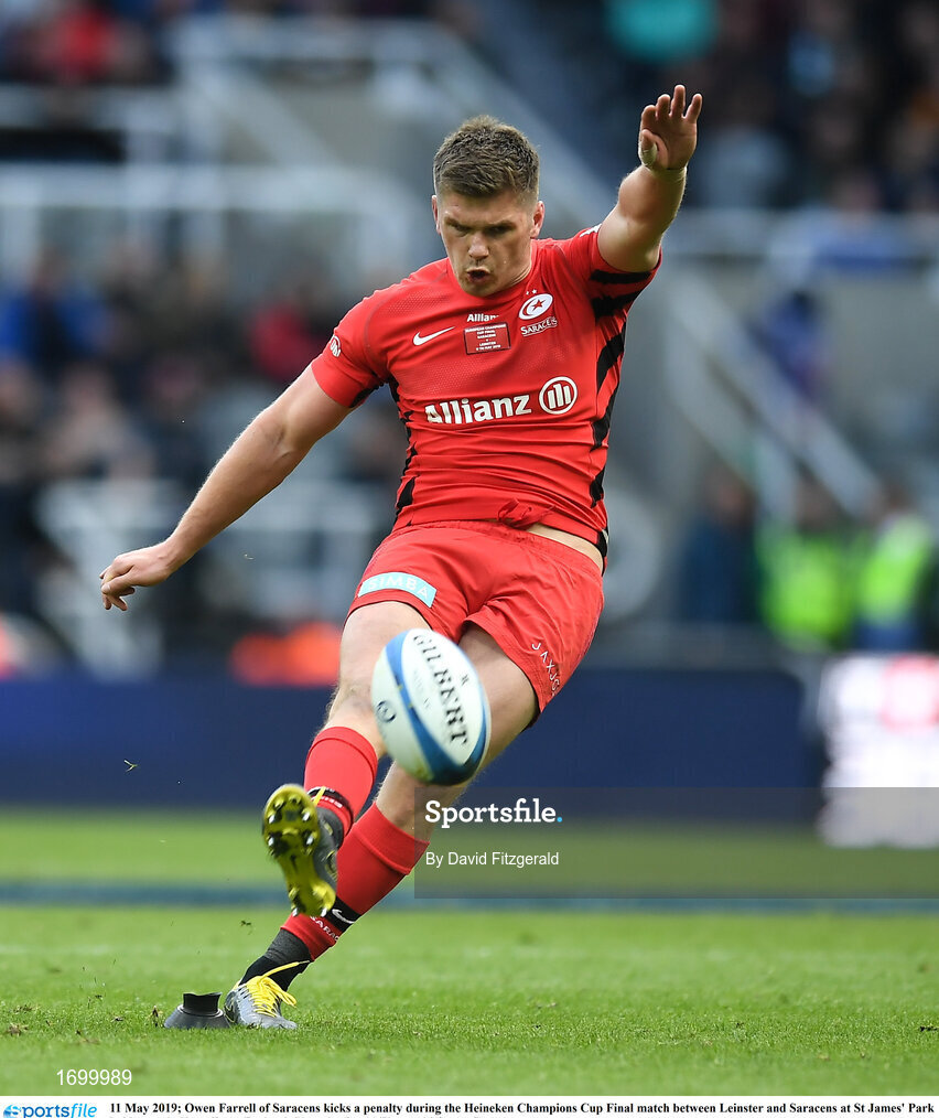 11 May 2019; Owen Farrell of Saracens kicks a penalty during the Heineken Champions Cup Final match between Leinster and Saracens at St James' Park in Newcastle Upon Tyne, England. Photo by David Fitzgerald/Sportsfile