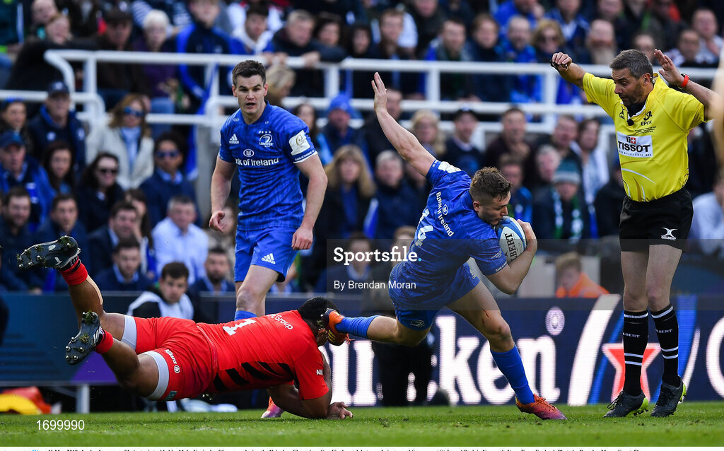 11 May 2019; Jordan Larmour of Leinster is tackled by Mako Vunipola of Saracens during the Heineken Champions Cup Final match between Leinster and Saracens at St James' Park in Newcastle Upon Tyne, England. Photo by Brendan Moran/Sportsfile