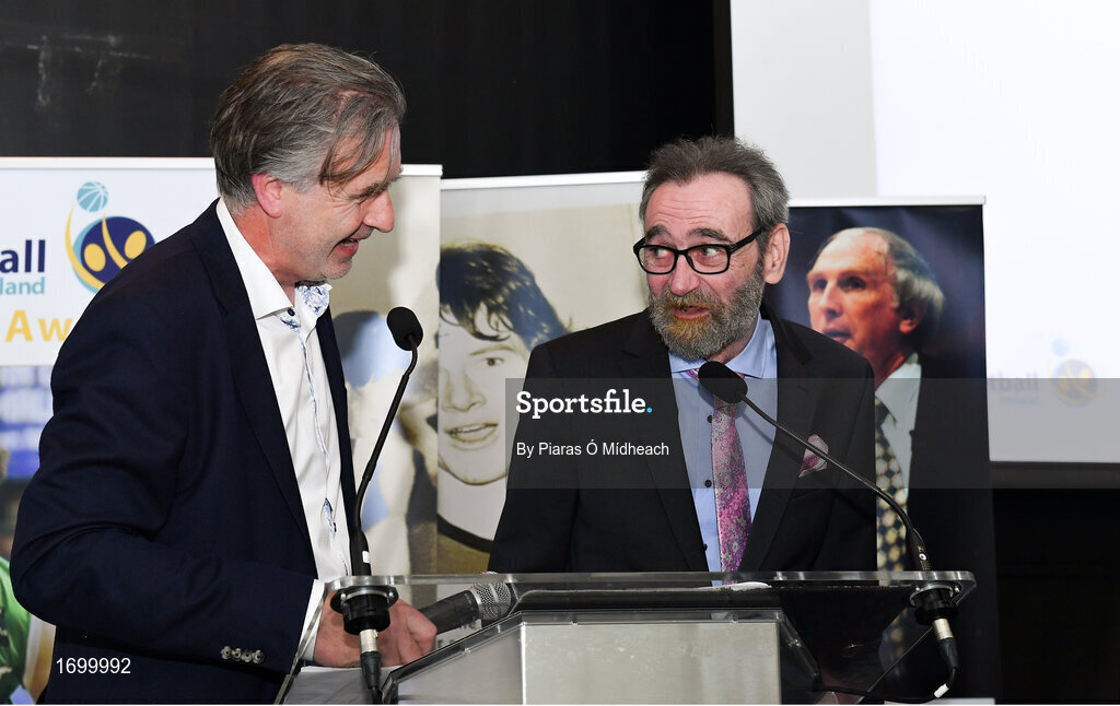 11 May 2019; Presidents Lifetime Achievement Award winner Joey Boylan, right, is interviewed by MC John Irwin during the Basketball Ireland 2018/19 Annual Awards and Hall of Fame at the Cusack Suite, Croke Park in Dublin. Photo by Piaras Ó Mídheach/Sportsfile