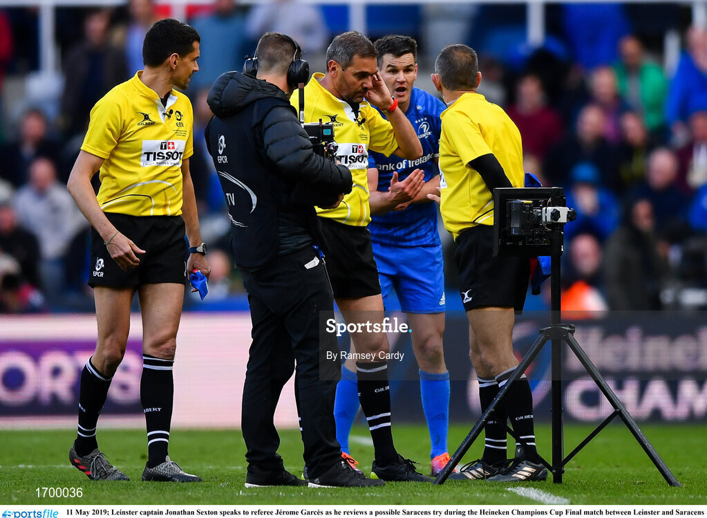 11 May 2019; Leinster captain Jonathan Sexton speaks to referee Jérome Garcès as he reviews a possible Saracens try during the Heineken Champions Cup Final match between Leinster and Saracens at St James' Park in Newcastle Upon Tyne, England. Photo by Ramsey Cardy/Sportsfile