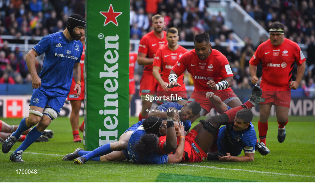 11 May 2019; Maro Itoje of Saracens is held up short of the try line by James Lowe of Leinster during the Heineken Champions Cup Final match between Leinster and Saracens at St James' Park in Newcastle Upon Tyne, England. Photo by Brendan Moran/Sportsfile